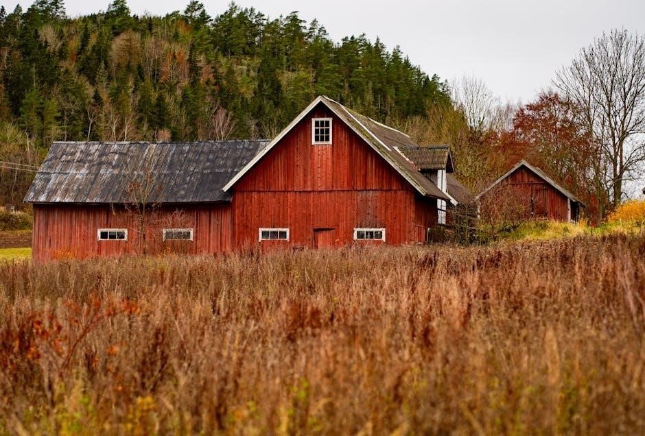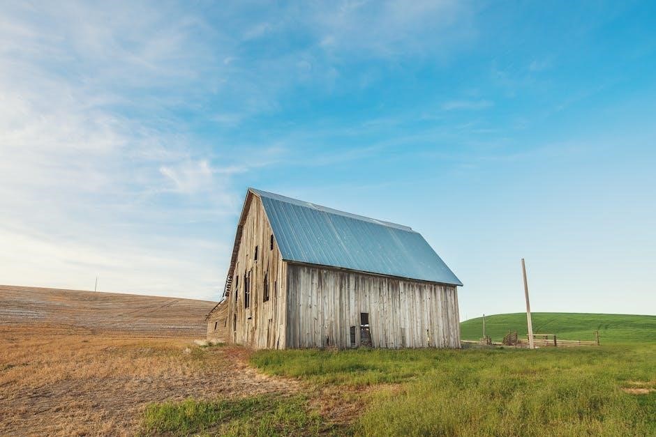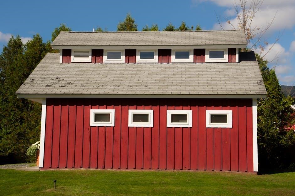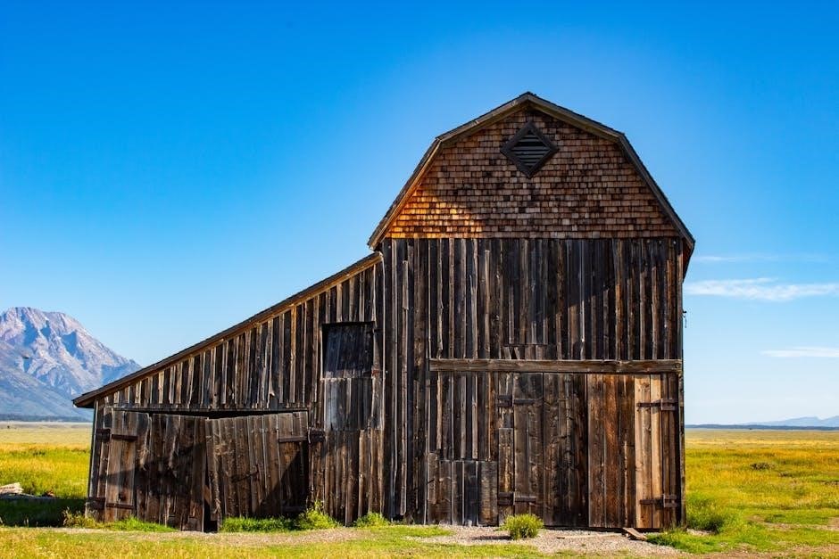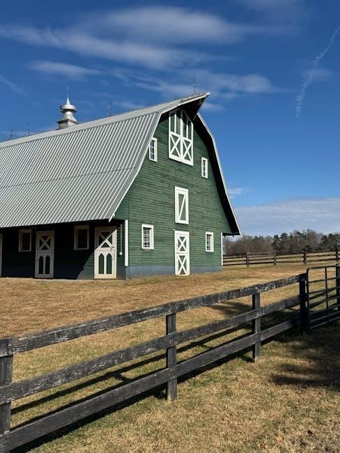 Pole barn plans PDF cater to diverse needs, offering specialized designs. Agricultural plans prioritize large, open spaces for livestock or equipment storage, often including stalls and hay storage areas. Storage plans focus on maximizing usable space for vehicles, tools, or general belongings, frequently incorporating large doors and minimal interior partitions.